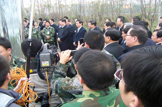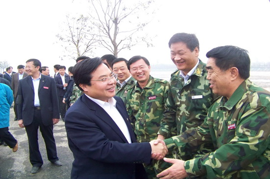 4月10日上午,山東省黨政代表團在省委書記姜異康、省長姜大明率領(lǐng)下,到北川新縣城檢查指導(dǎo)援建工作,山東省十七地市黨政負(fù)責(zé)人參加檢查。徐鵬強董事長在集團公司援建的安昌河堤頂?shù)缆飞嫌訖z查團并陪同檢查。