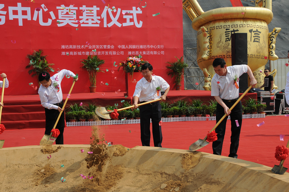 5月19日上午9時18分,濰坊金融服務中心項目舉行奠基儀式,集團公司董事長徐鵬強出席奠基儀式并參加培土奠基。出席奠基儀式的還有濰坊市委常委、高新區黨工委書記、管委會主任趙志遠,高新區黨工委副書記、管委會副主任張龍江,高新區金融辦主任安斌,高新區城投公司董事長牟丕宗,中國人民銀行濰坊中心支行行長劉福毅。高新區城投公司以及承建該 項目的第四分公司有關人員共100余人參加了奠基儀式。