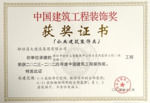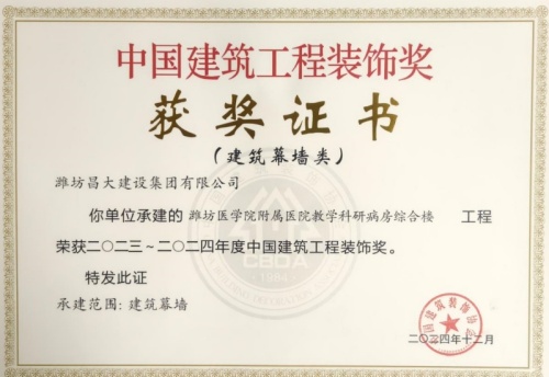 2024年12月10日,中國建筑裝飾協會在北京召開大會,表彰2023~2024年度“中國建筑工程裝飾獎”工程。集團裝飾幕墻工程公司、山東鳶港裝飾工程有限公司的三項工程榮獲五個獎項:濰坊醫學院附屬醫院教學科研病房綜合樓(建筑幕墻類和幕墻設計類)、濰坊市婦女兒童健康中心病房樓(公共建筑裝飾類和公共建筑裝飾設計類),柒星國際2#住宅樓(建筑幕墻類)。